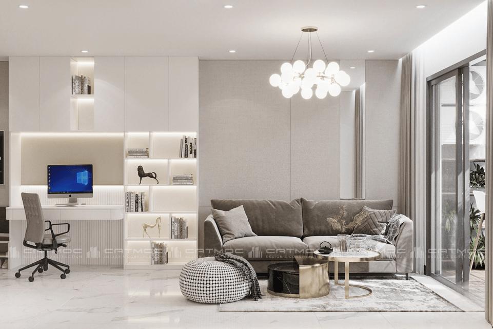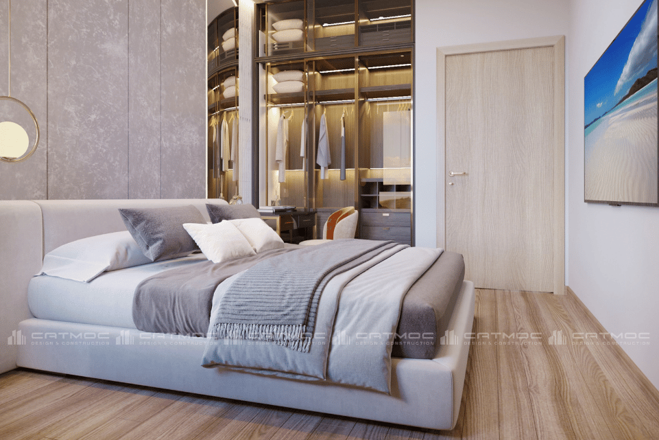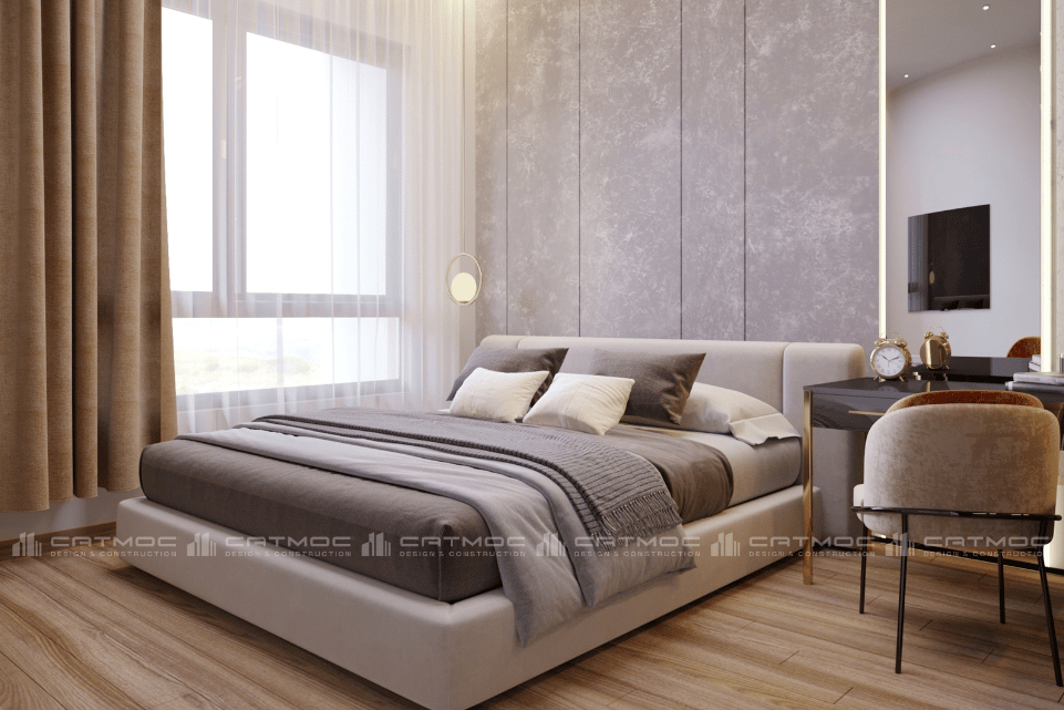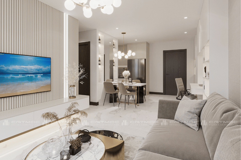 Căn hộ này mang phong cách hiện đại, tối giản nhưng vẫn giữ được sự ấm áp nhờ bảng màu trung tính kết hợp với chất liệu gỗ và da nâu trầm. Thiết kế không gian mở giữa phòng khách, bếp và khu vực ăn giúp tối ưu diện tích, đồng thời tạo sự liền mạch trong sinh hoạt.